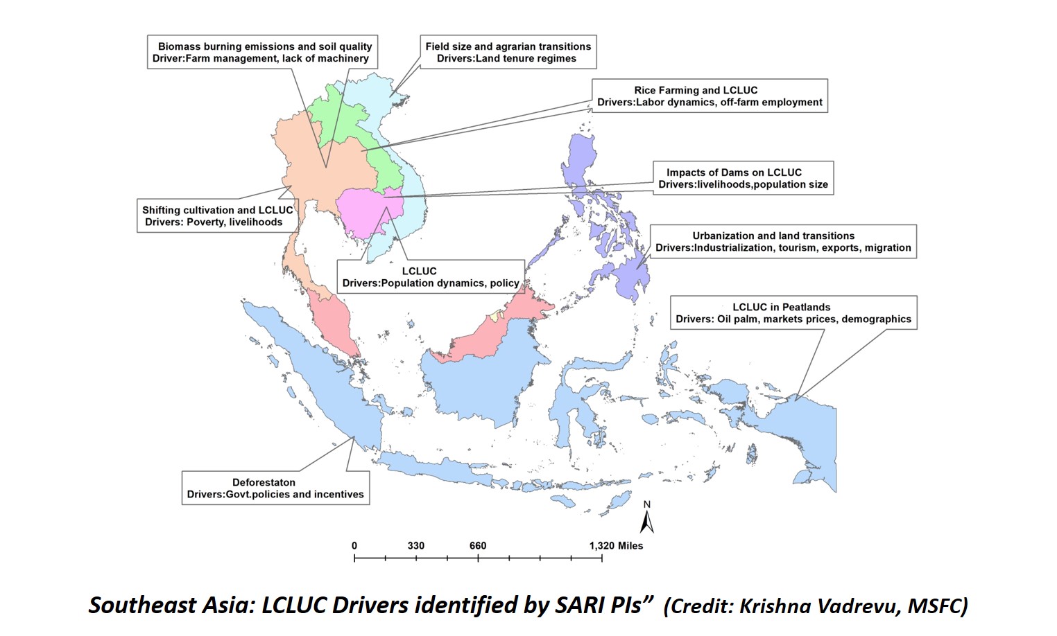 SARI's vision is to develop innovative research, education, capacity building, and training programs involving state-of-the-art remote sensing, natural sciences, engineering, and social sciences useful for US and South Asia country researchers. Moreover, we would like to emphasize fundamental ecological and social processes, including climate changes that reflect regional concerns relating to LCLUC and impacts that cut across regional boundaries. Some of the vital land use/cover change drivers identified by the SARI researchers in SEARRIN countries are shown in the figure.